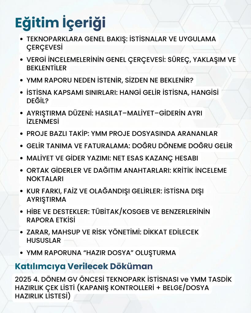 Teknopark firmaları için kritik öneme sahip olan YMM tasdik süreçleri, Ar-Ge ve teknopark mevzuatına uygun dönem sonu kapanışları bu eğitimde tüm detayları ile ele alınıyor.