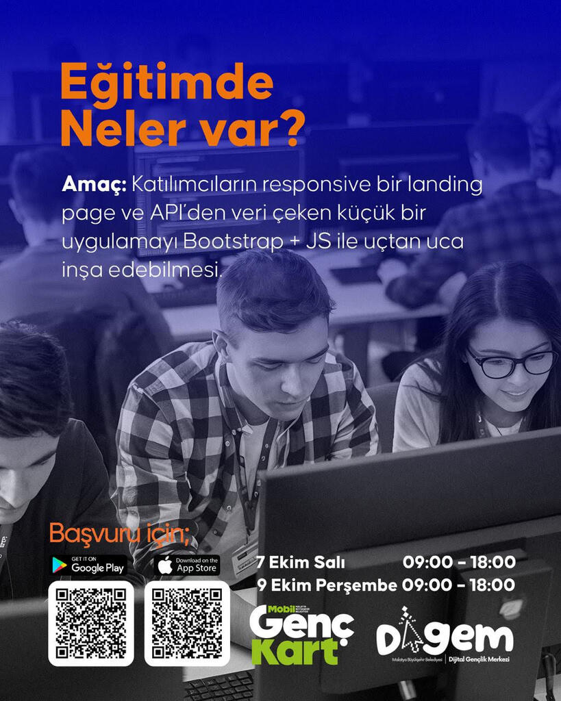 Katılımcıların responsive bir landing page ve API’den veri çeken küçük bir uygulamayı Bootstrap + JS ile uçtan uca inşa edebilmesi